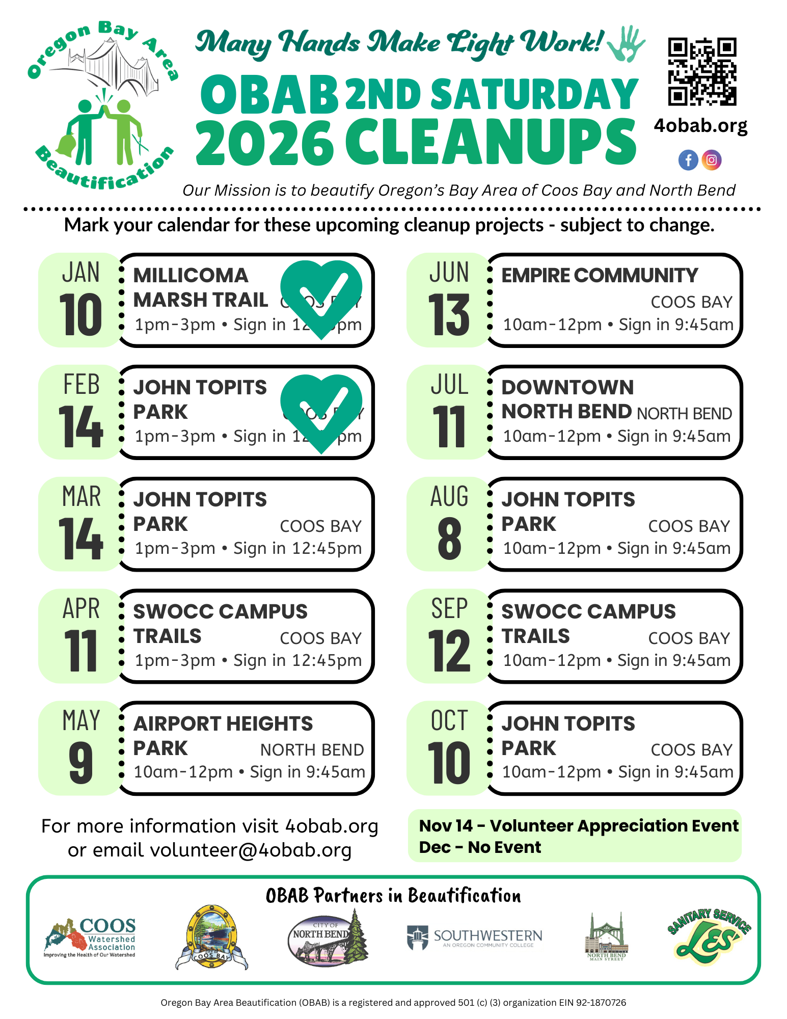 Come spend a couple of hours with the Oregon Bay Area Beautification (OBAB) group and the Coos Bay Parks Department to help beautify John Topits Park in Coos Bay. The 2nd Saturday cleanup will be on Saturday, March 14, 2026.