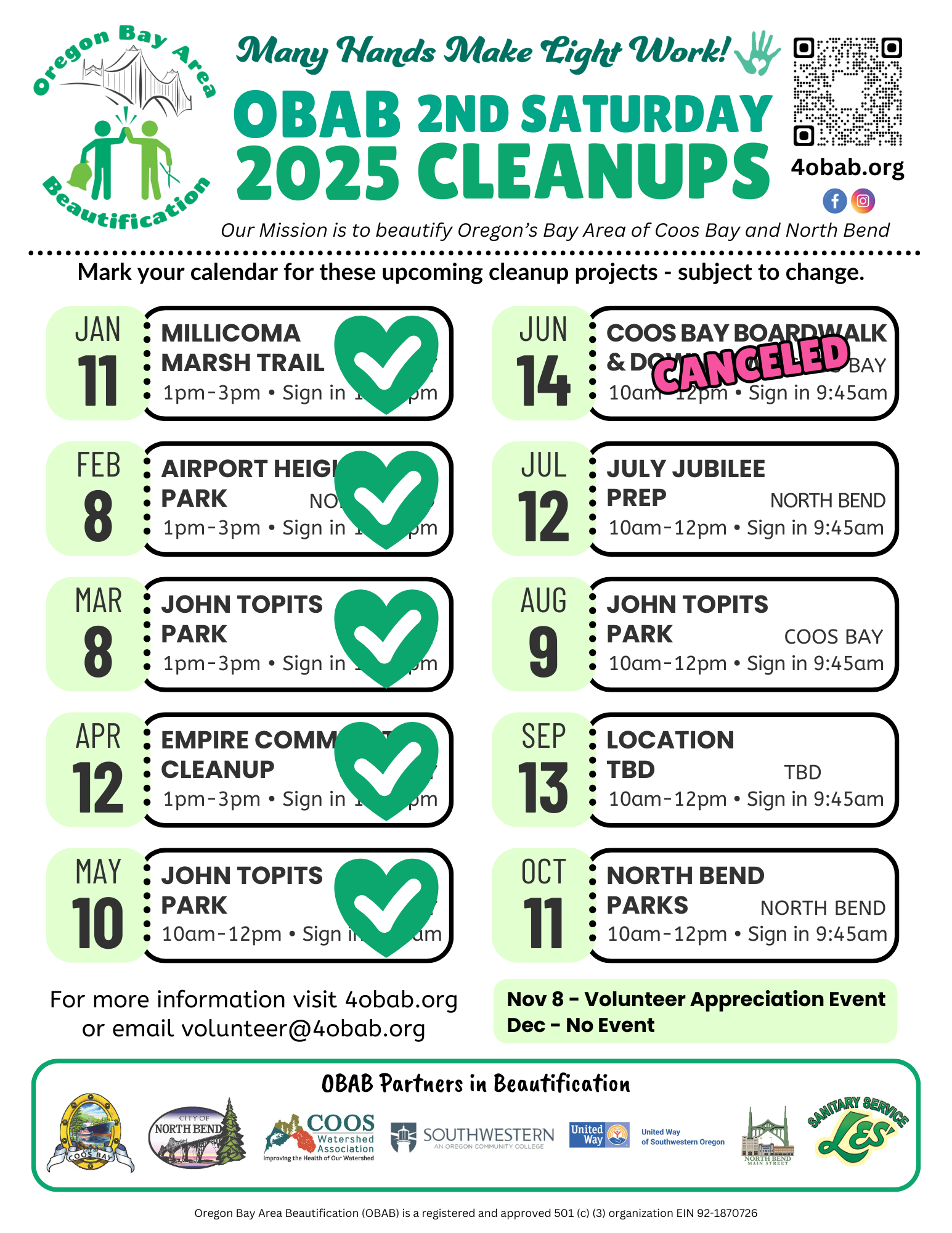 Come spend a couple of hours with the Oregon Bay Area Beautification (OBAB) group to help beautify the Millicoma Marsh Trail, in Coos Bay on Saturday, January 10, 2026.